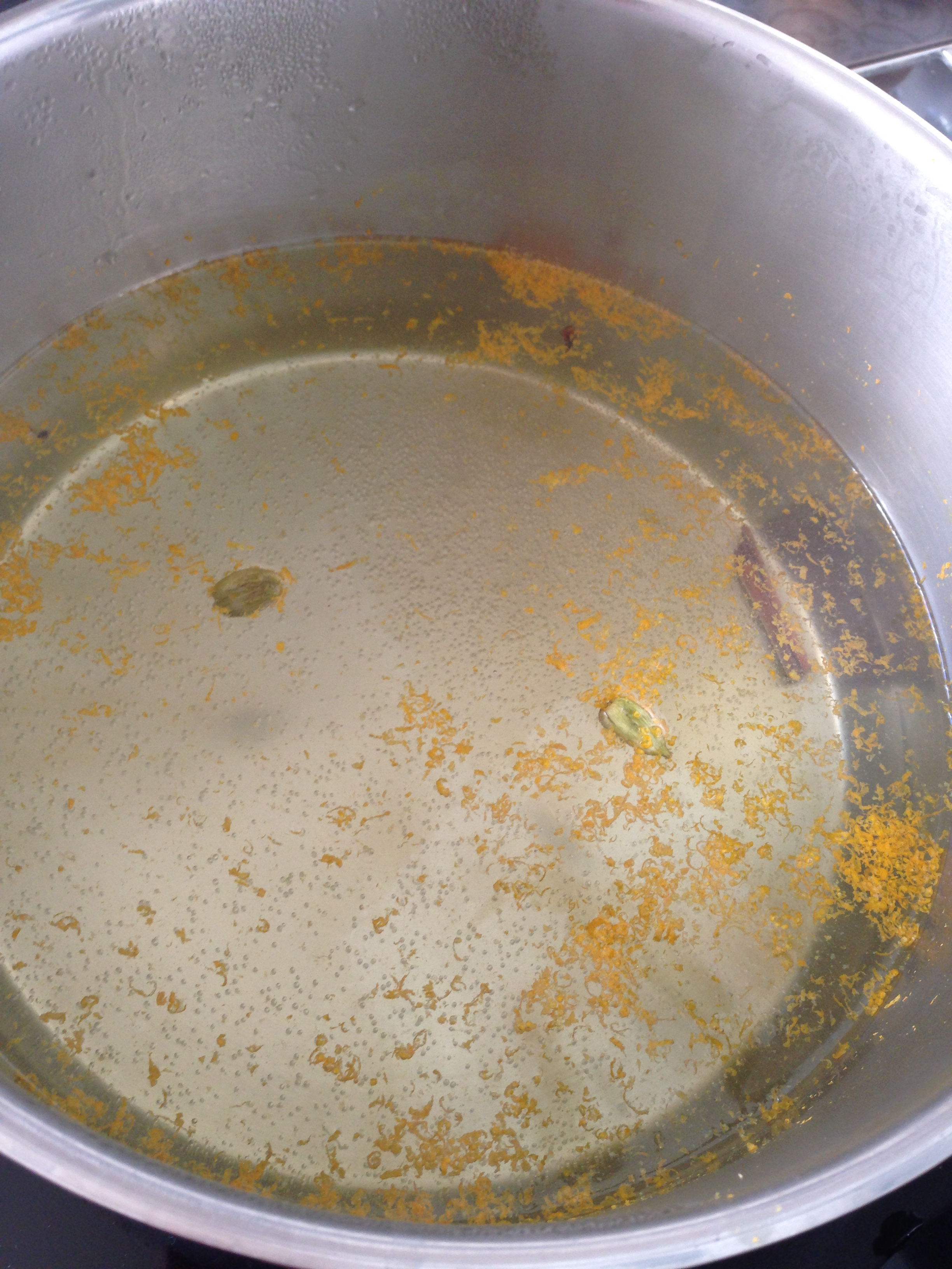 Ha ca.2 liter vann i en stor kjele, tilsett 2 av kardemommekapslene, kanelstang, nellik og matfargen. Riv skall av appelsinene, og ha i vannet, pass på å ikke få med det hvite for det gir en bitter smak.