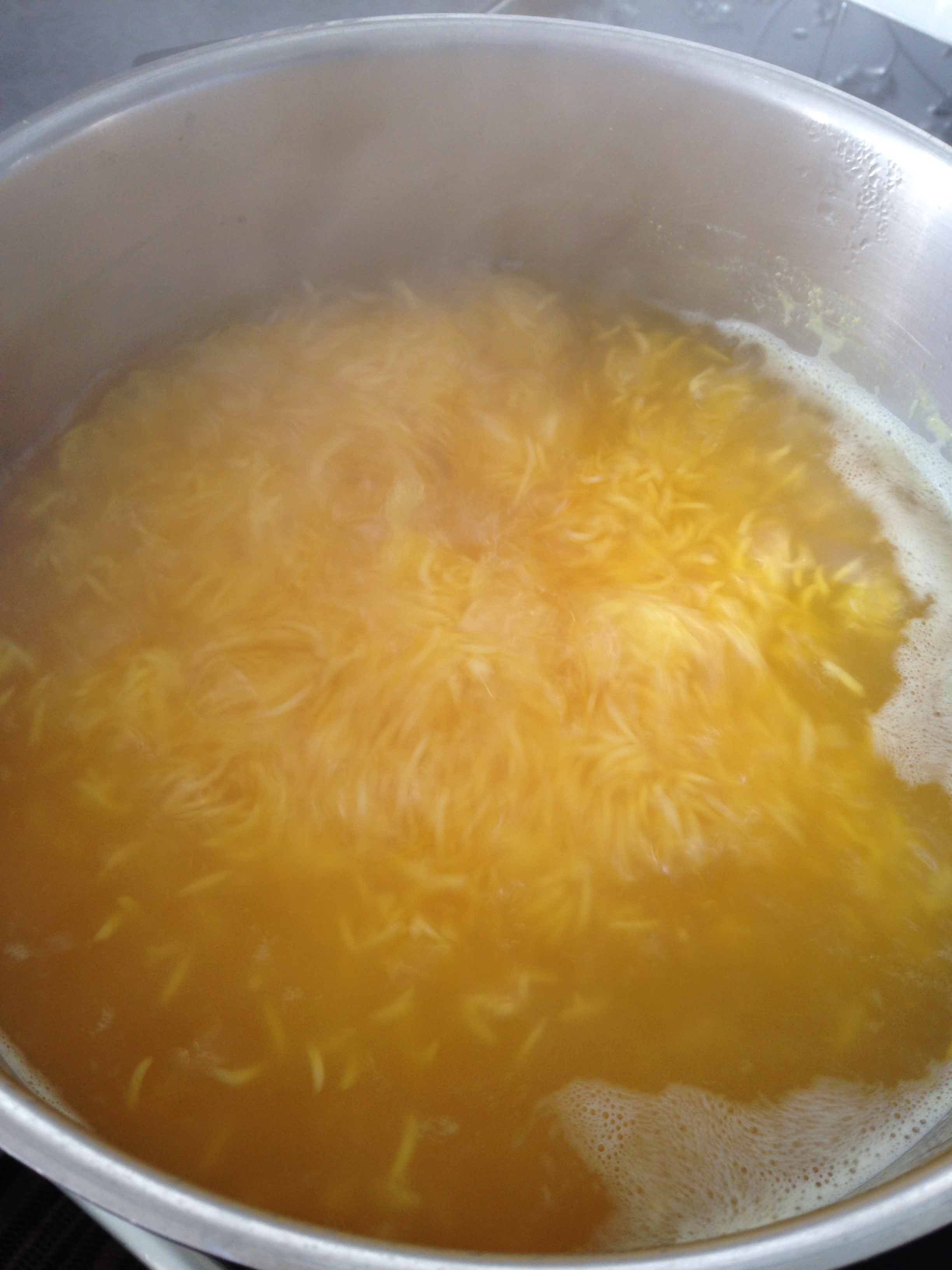 Ha risen over i en sil og deretter over i kjelen med det kokende vann. Det skal nå koke til risen er 3/4 ferdig, det kjenner man etter ved å ta ut noen riskorn mellom fingrene og presse, de skal ikke kunne moses lett. Er du tvil la det heller koke litt mer enn mindre.