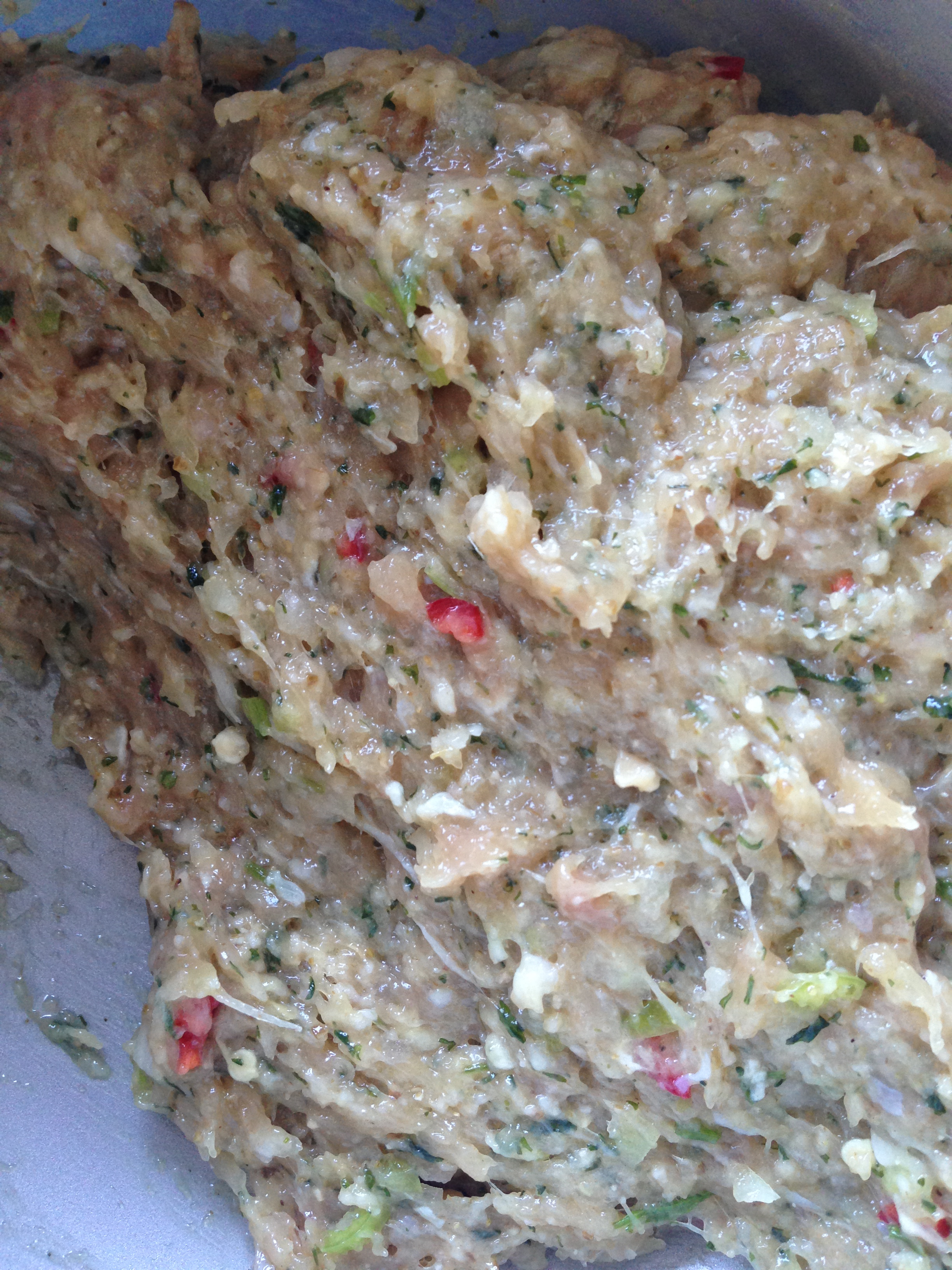 Ha kyllingkjøttdeig i en bolle og bland alle ingrediensene godt sammen.