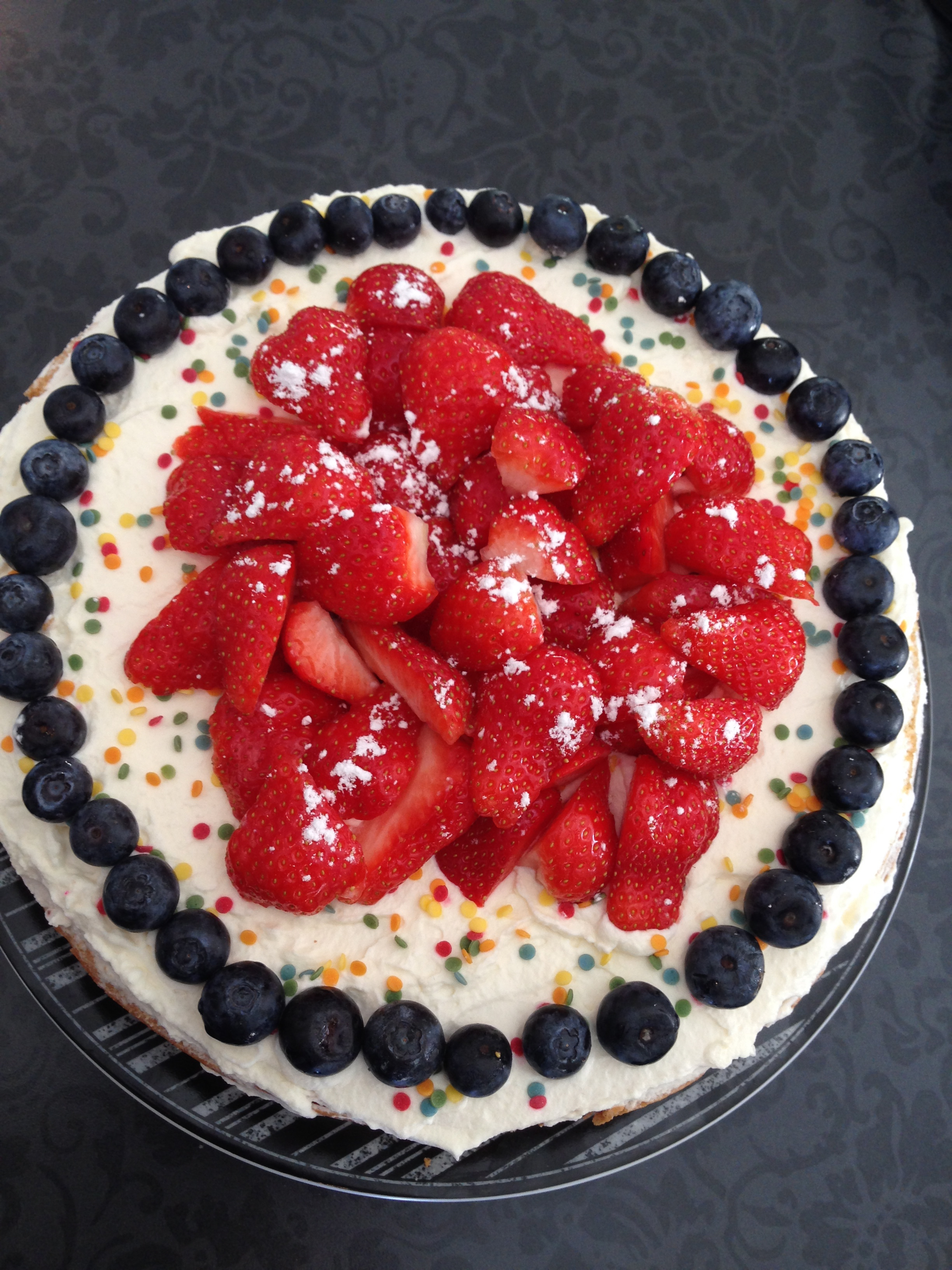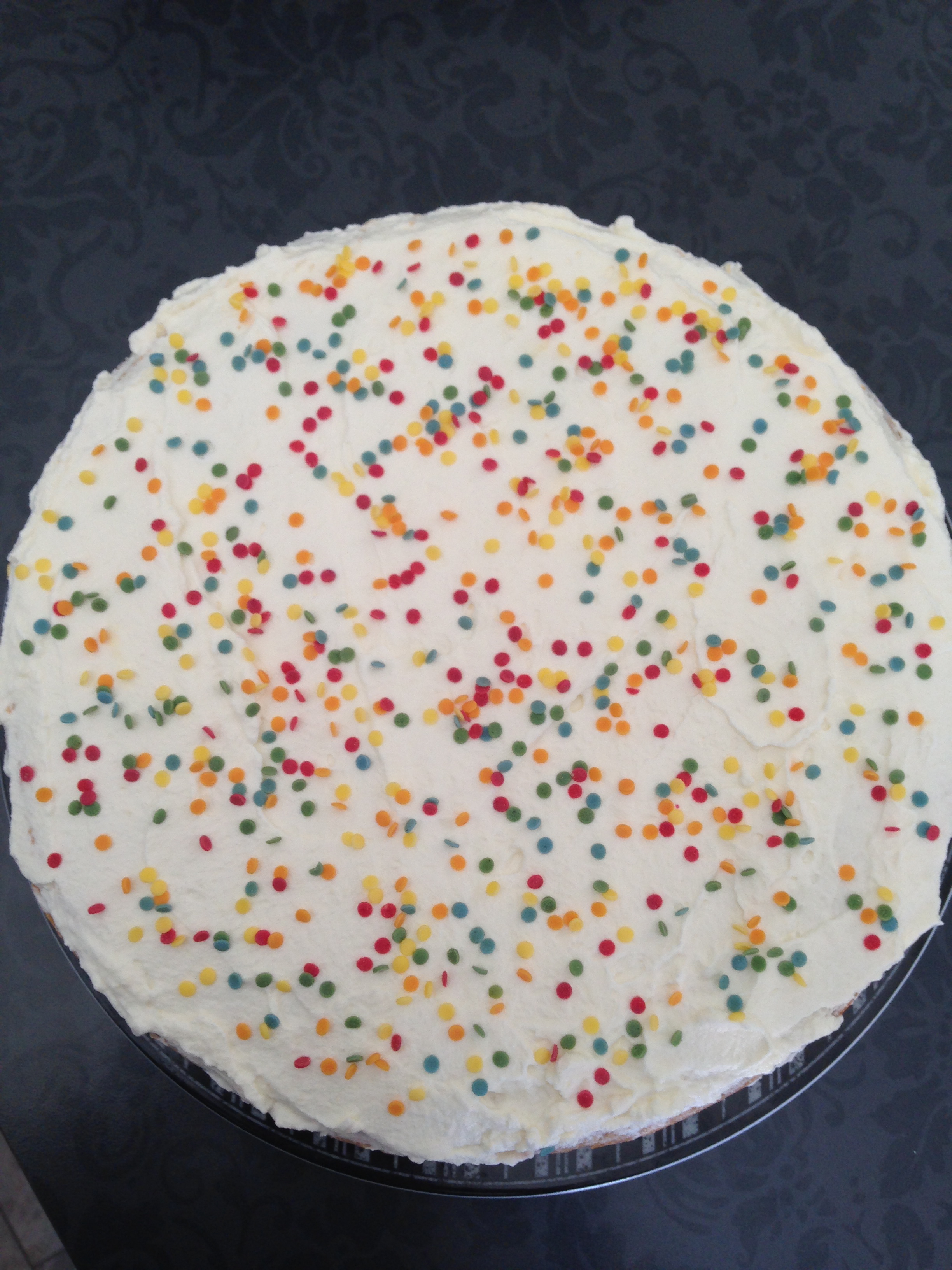 Delte bunnen i 3 deler og dynket den med appelsinjuice. Jeg pisket krem med 2 ss sukker og 1 ts vaniljesukker. Tok ut 5ss som jeg satte til side, blandet resten forsiktig med vaniljekrem. Hadde tropisk frukt og ekstra ananas i halvparten av kremen og 1 ss jordbærsyltetøy og jordbær delt i 4 i resten av kremen. Dekket kaken tynt med krem som jeg hadde satte til side, dette for at marsipanlokket skal holde seg på plass.