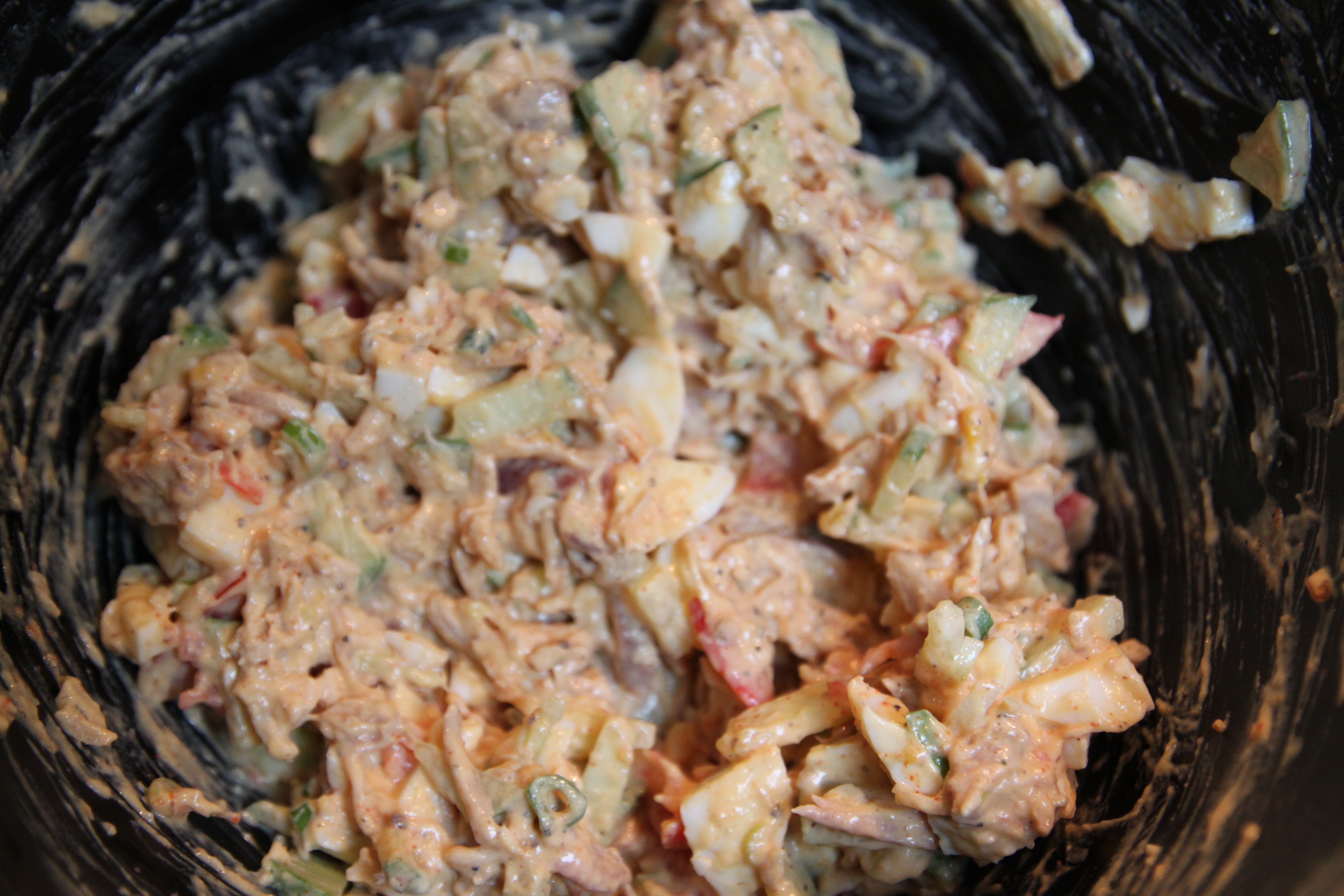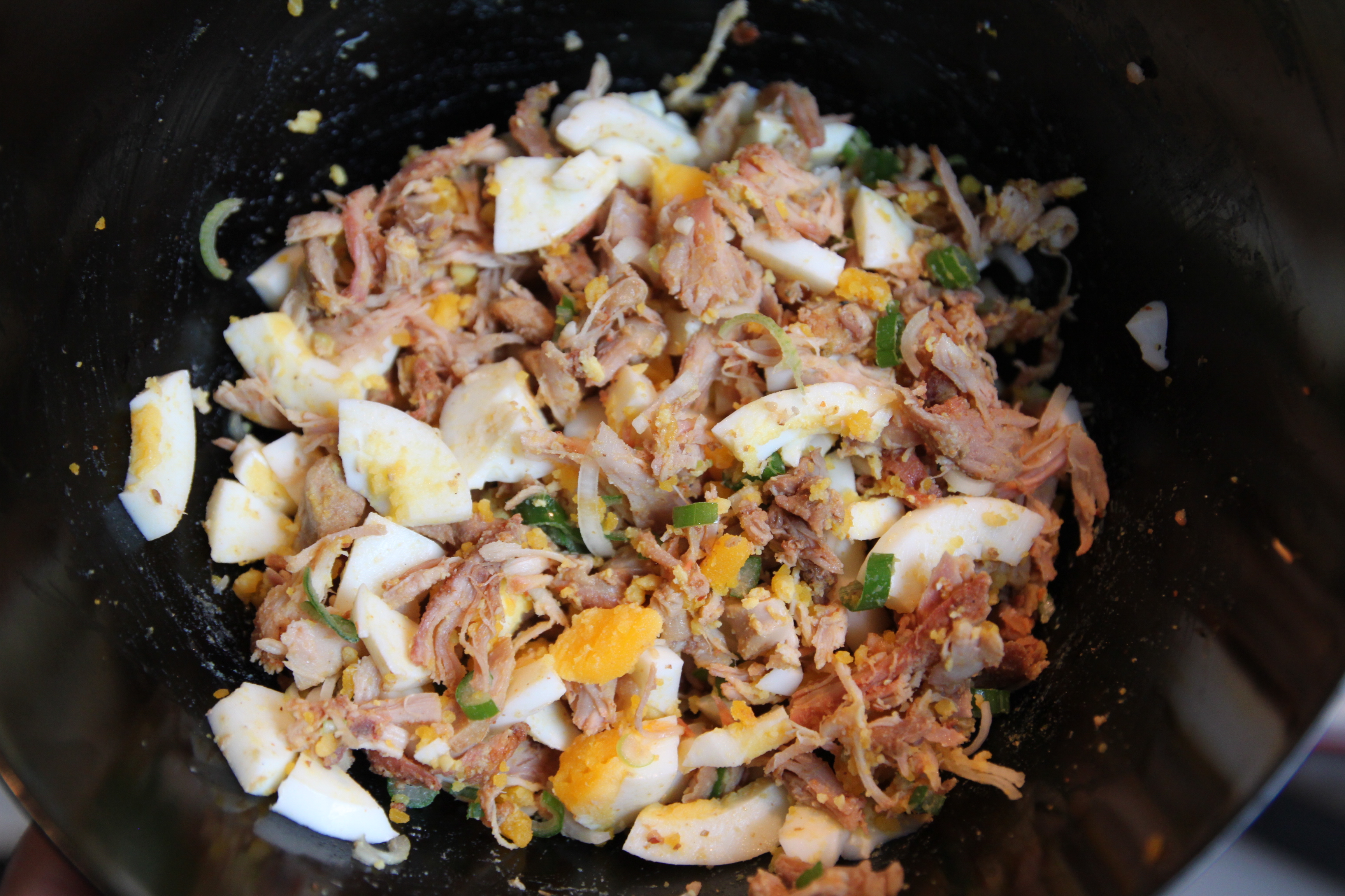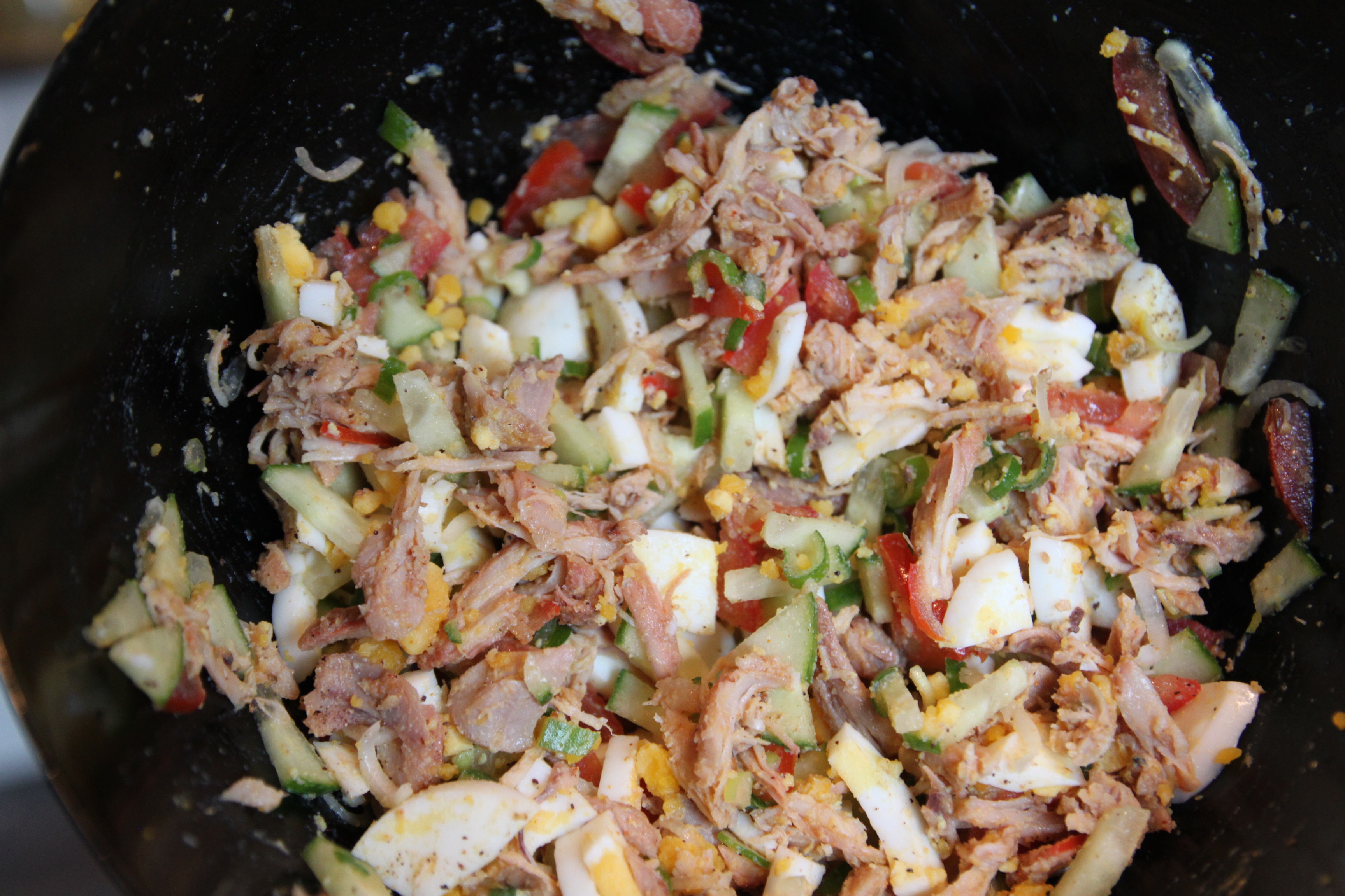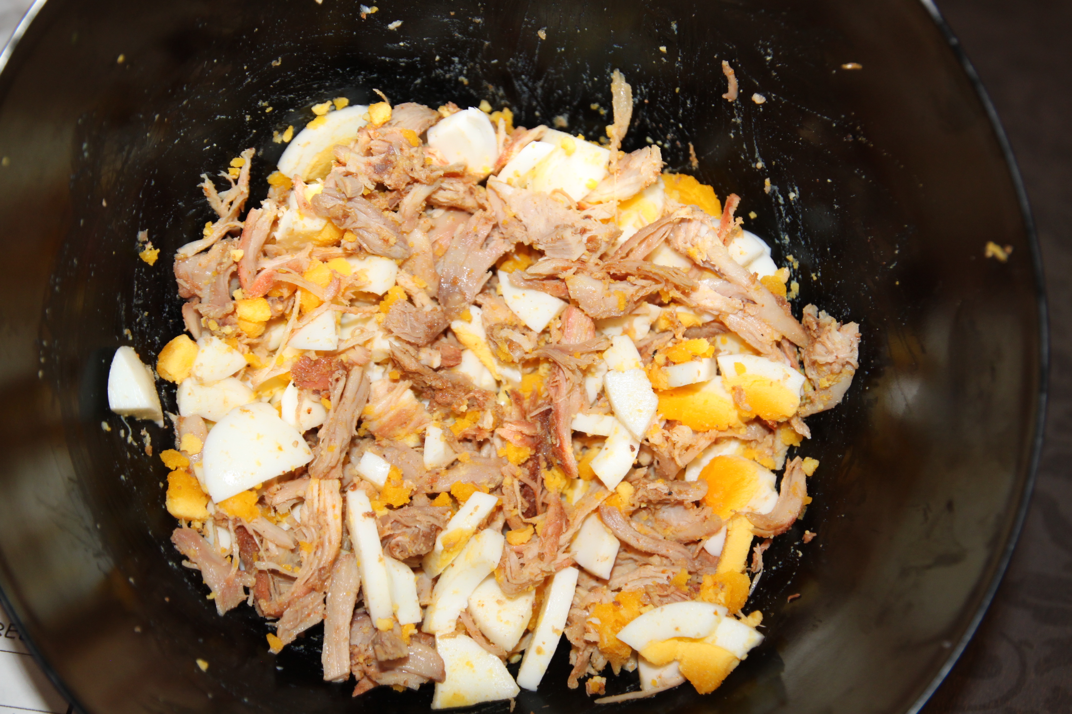 Del opp 2-3 egg og ha i samme bolle som kyllingen.