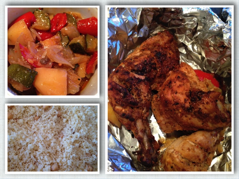 Tandoori kyllinglår og grønnsaker stekt i ovnen, sammen med couscous og kikerter, er en enkel middag som smaker veldig godt.