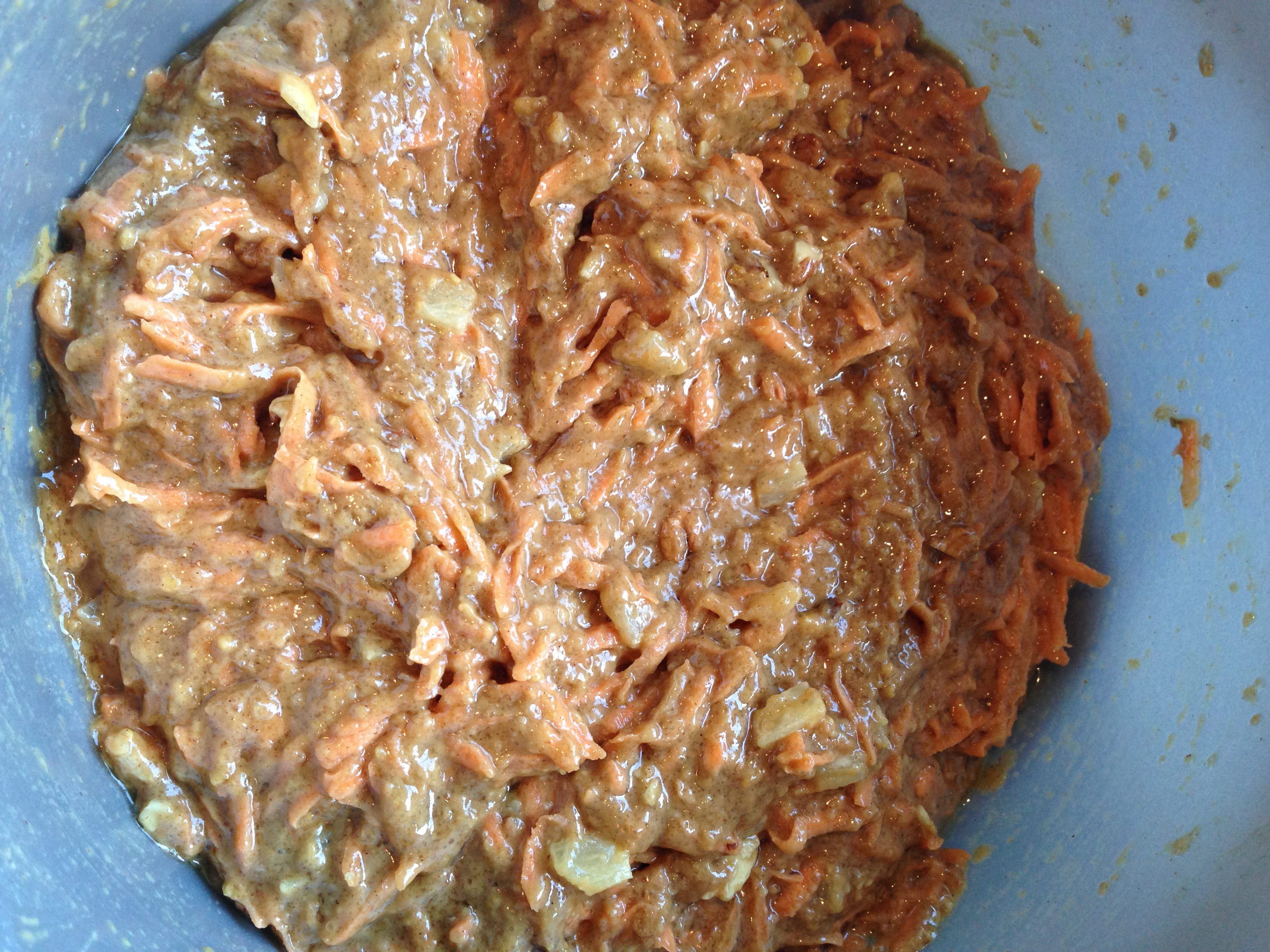 Rør inn olje, ananas juice, ananas, gulrøtter og eventuelt hakkede valnøtter. Ikke rør mer enn nødvendig, ellers blir kaken tung og kompakt.