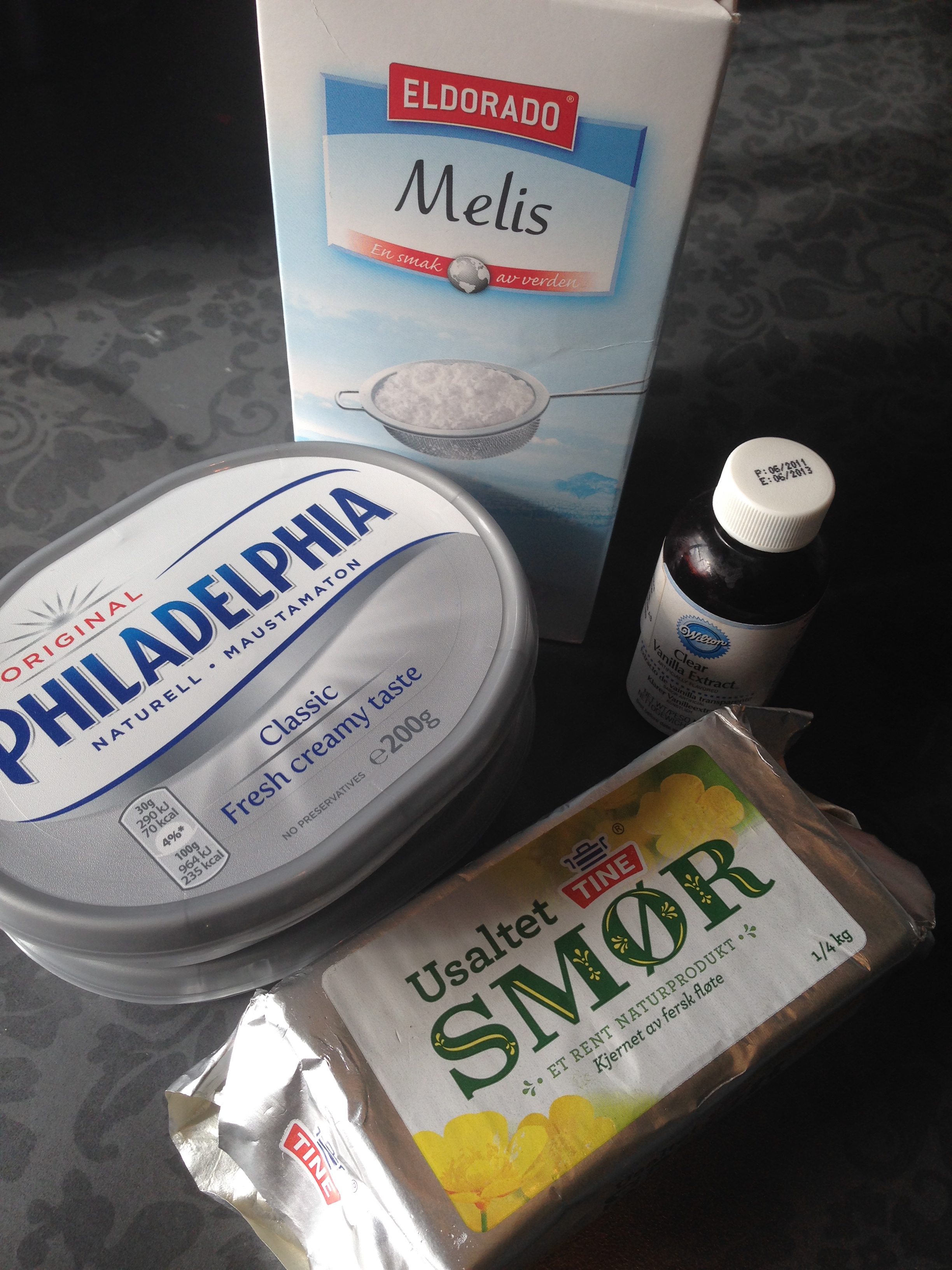 Rør smør og halvparten av melisen til smørkrem. Tilsett kremost, vaniljeessens og resten av melisen. Bland godt sammen til en glatt krem. Fordel kremen jevnt over den avkjølte kaken.