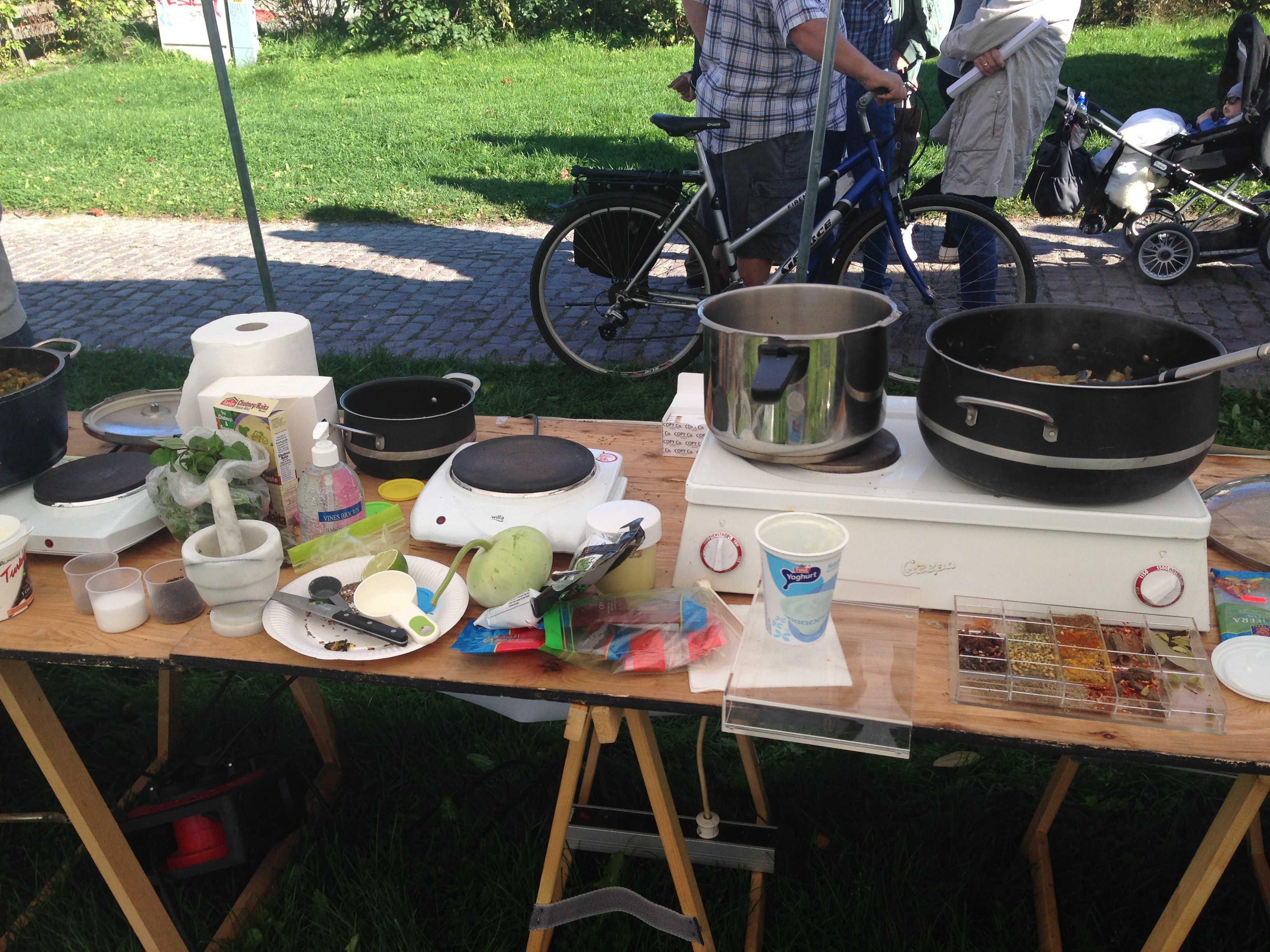 Med et lite tidspress så var det ikke helt så ryddig på bordet vårt da det stod på det verste. Men vi koste oss med de andre damene som stod i samme rekke og tilbredte mat fra sitt hjemmeland og stemningen var god. Det var mat fra Somalia, Nigeria og Japan i tillegg til Pakistan. Noen trodde de skulle stå og lage mat i et kjøkken, og hadde ikke med egnet utstyr. Å dele f.eks en hel kylling med grønnsakskniv fungerte ikke så bra, men vi lånte så klart ut det vi hadde av fjøl og kniver 🙂