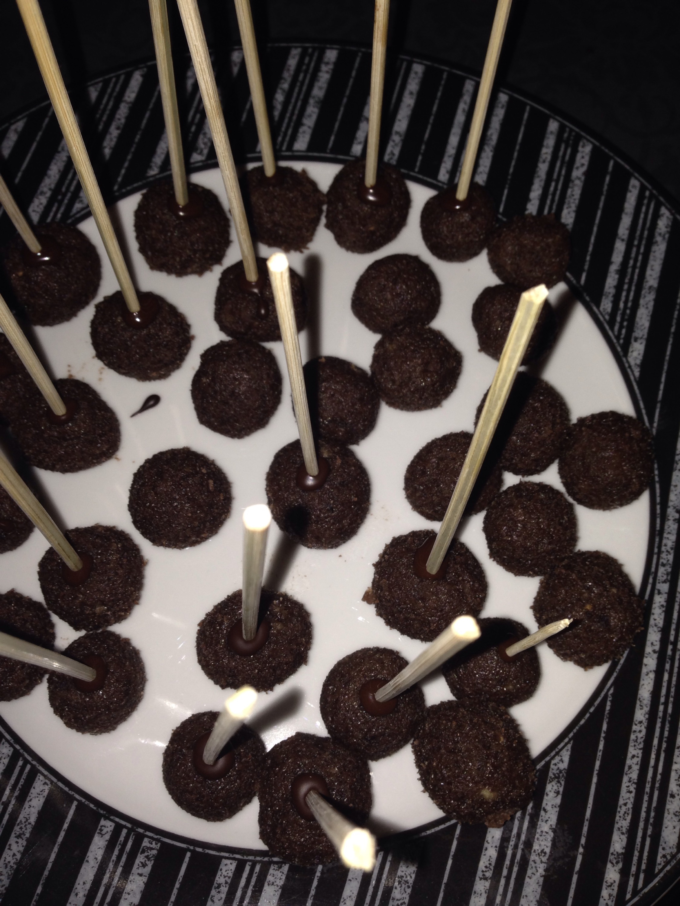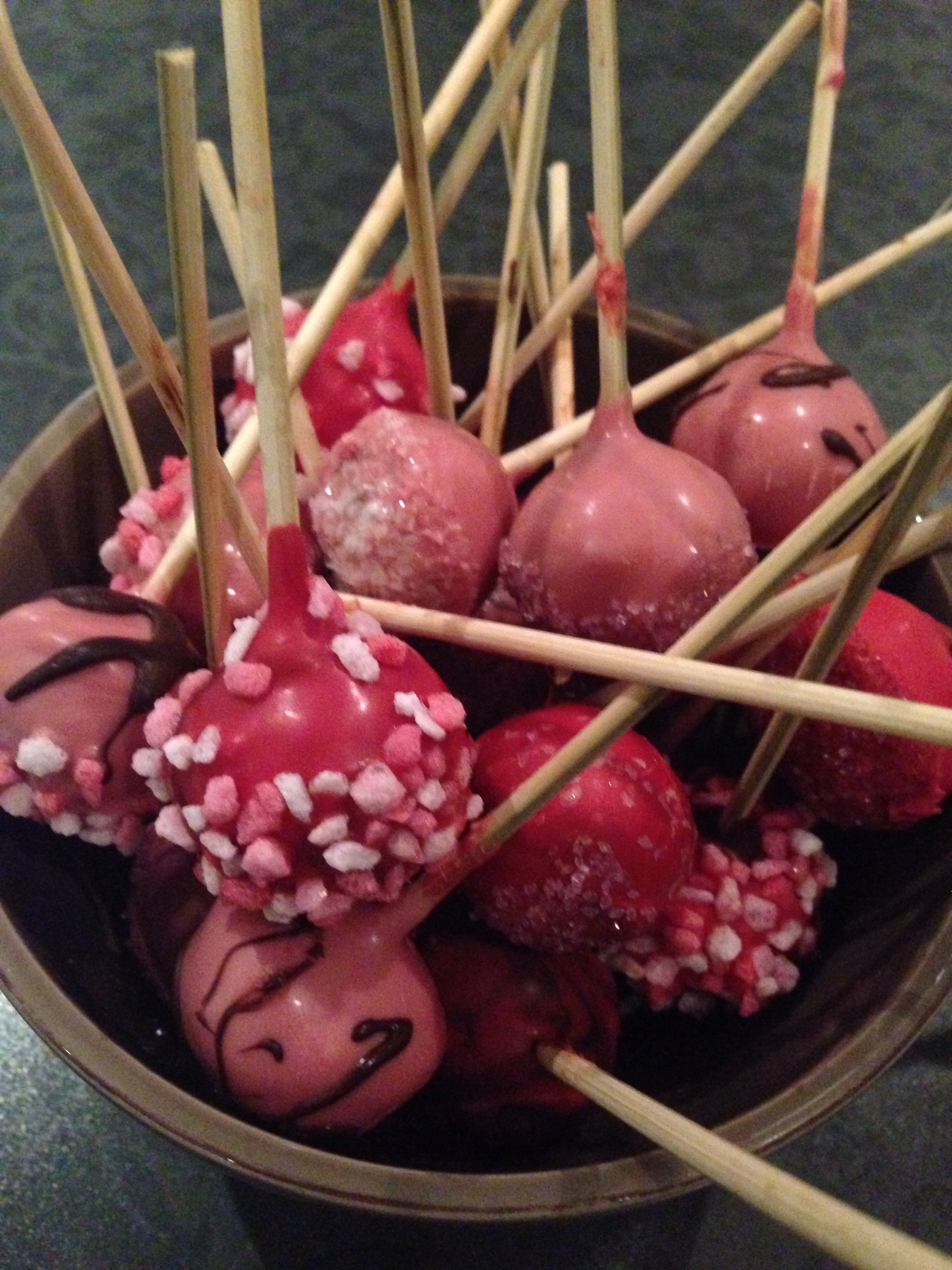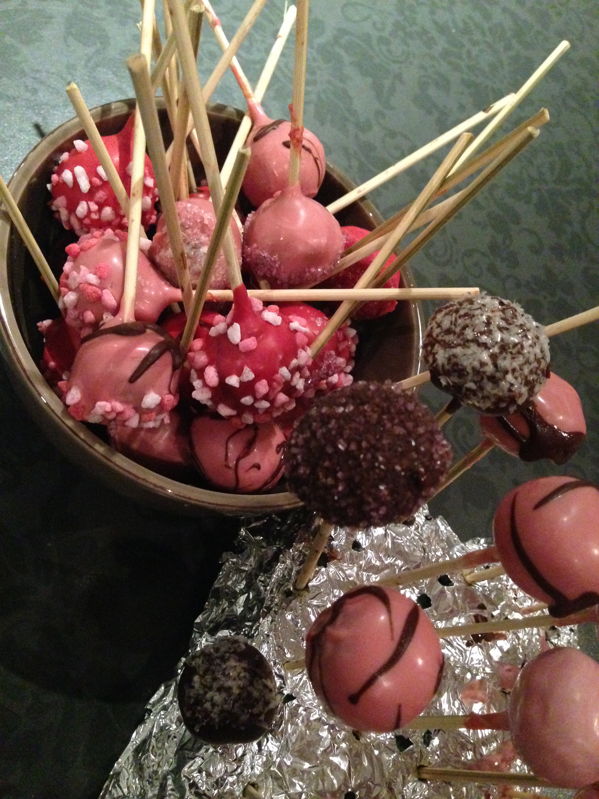 Fant rester av sjokoladesukkerbrød liggende i fryseren, tinte dem og blandet de med Tine naturell kremost og litt melis. Kjørte alt sammen med en håndmikser. Lagde kuler, lot de stå 10 minutter i fryseren, smeltet kokesjokolade og dyppet pinnene først i sjokoladen og så kulene, inn i kjøleskapet for 10 minutter før de ble dyppet de i rosa Candy melts fra Wilton og til slutt strøssel.