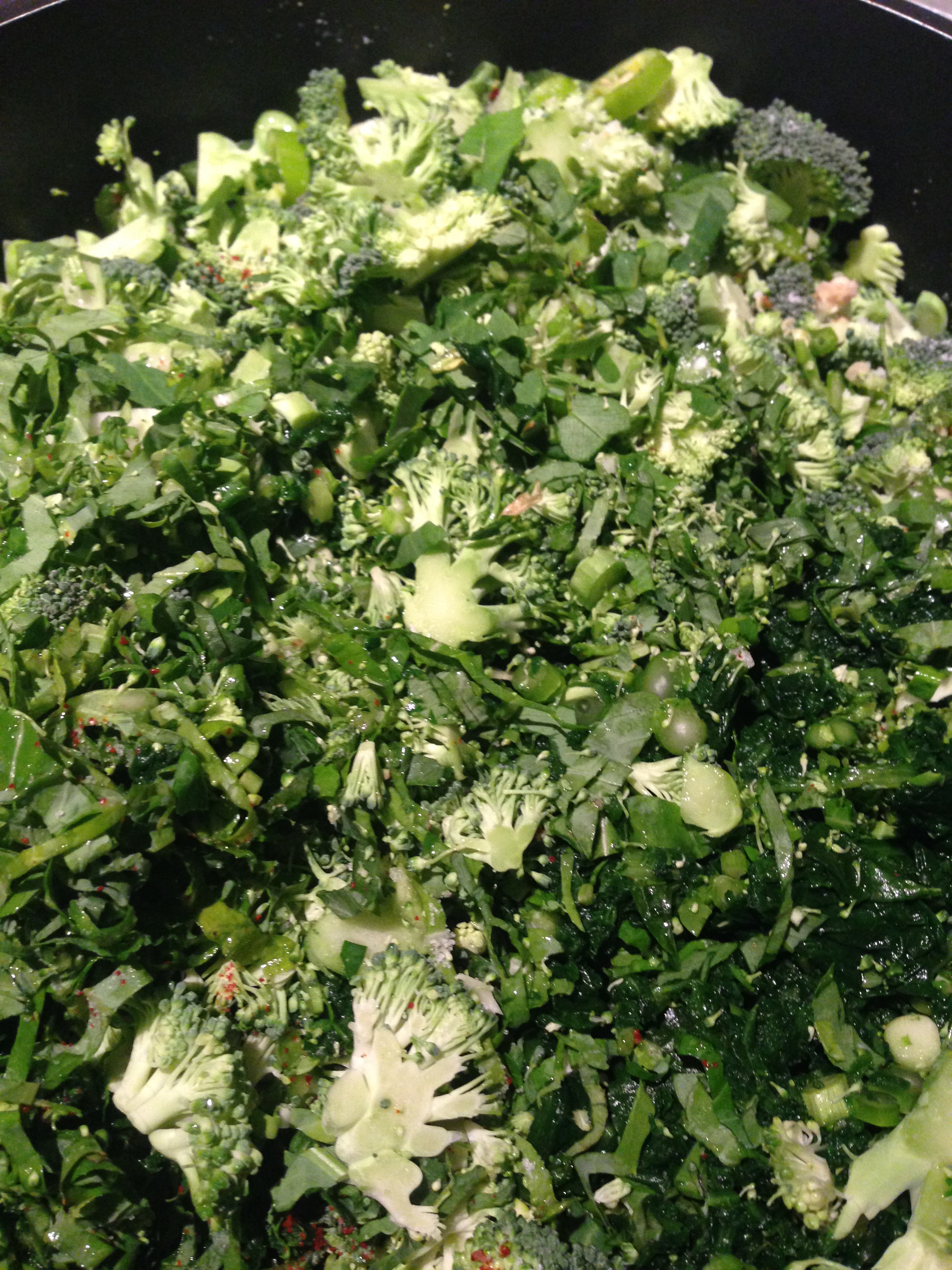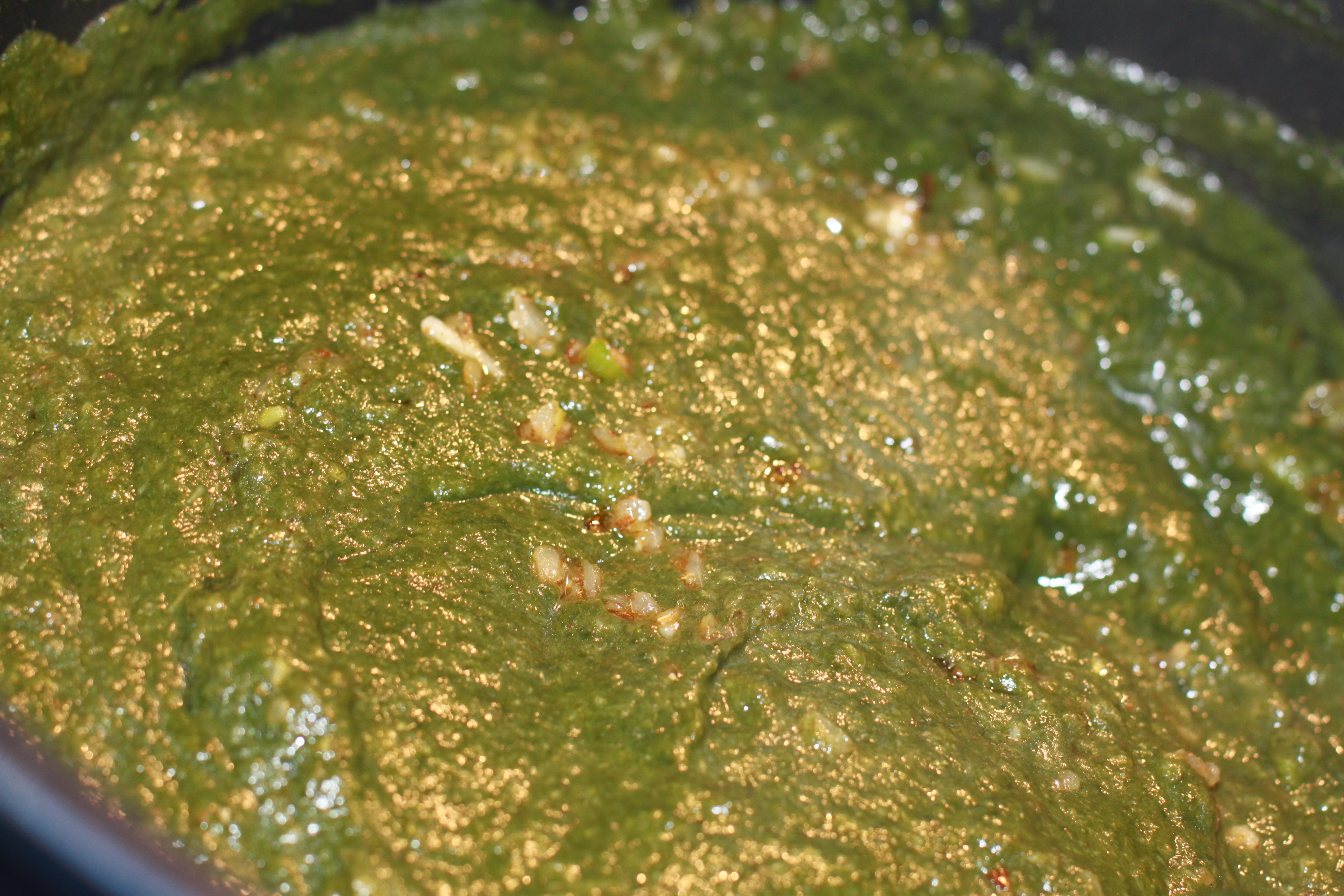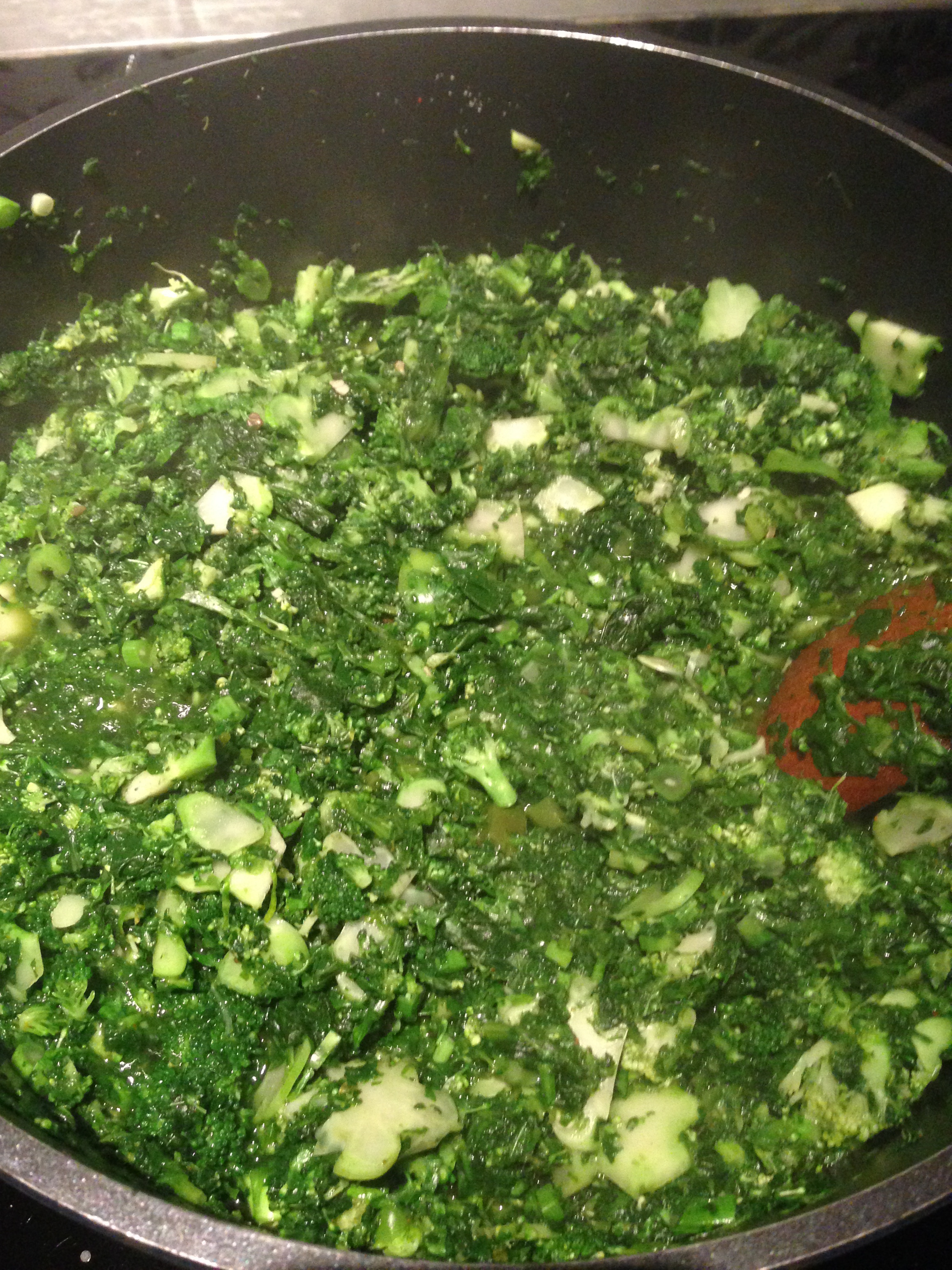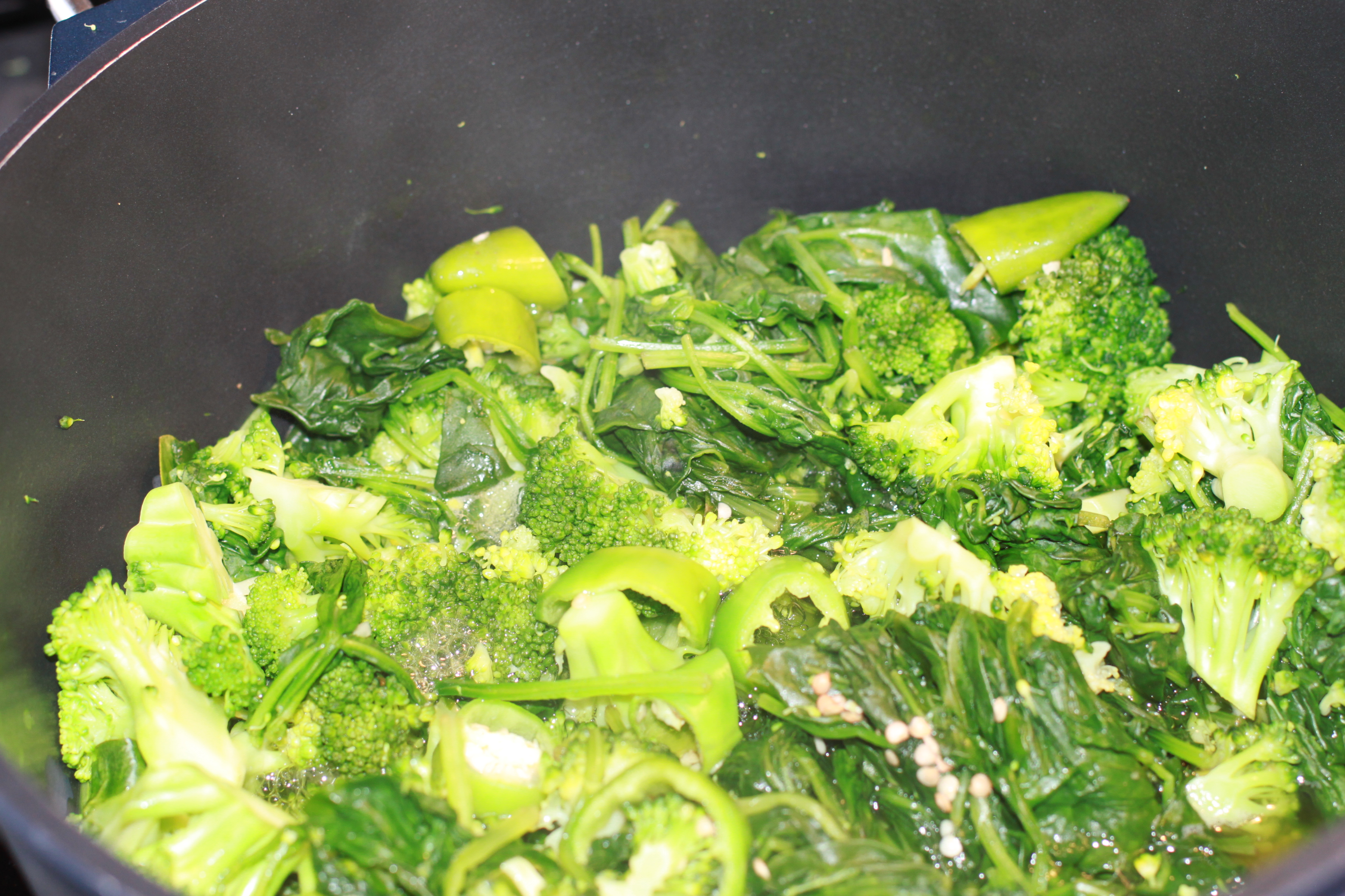 Bruk en stor kjel og ha i brokkolien, grønn chili, salt, chilipulver og spinat, frossen spinat fungerer kjempe fint. Har du sennespsblader og fersk bukkehornskløver, finhakk og tilsett dette også.