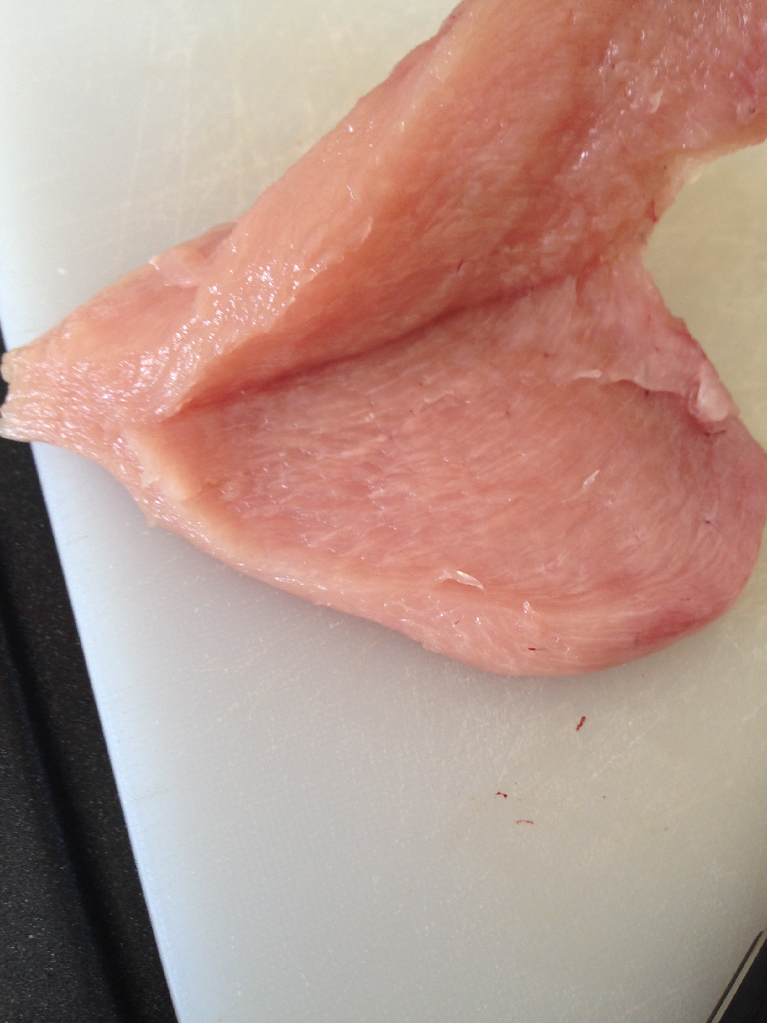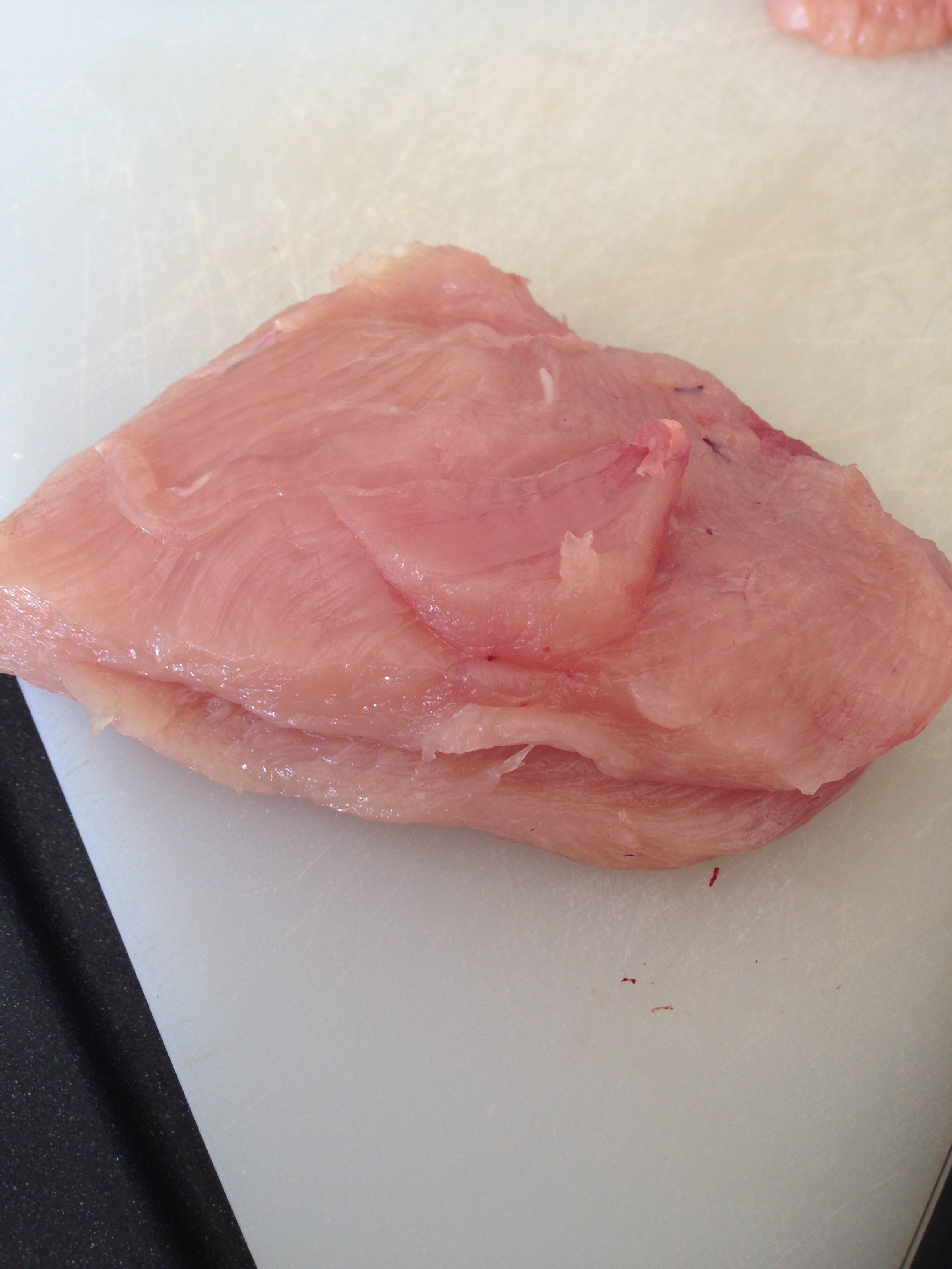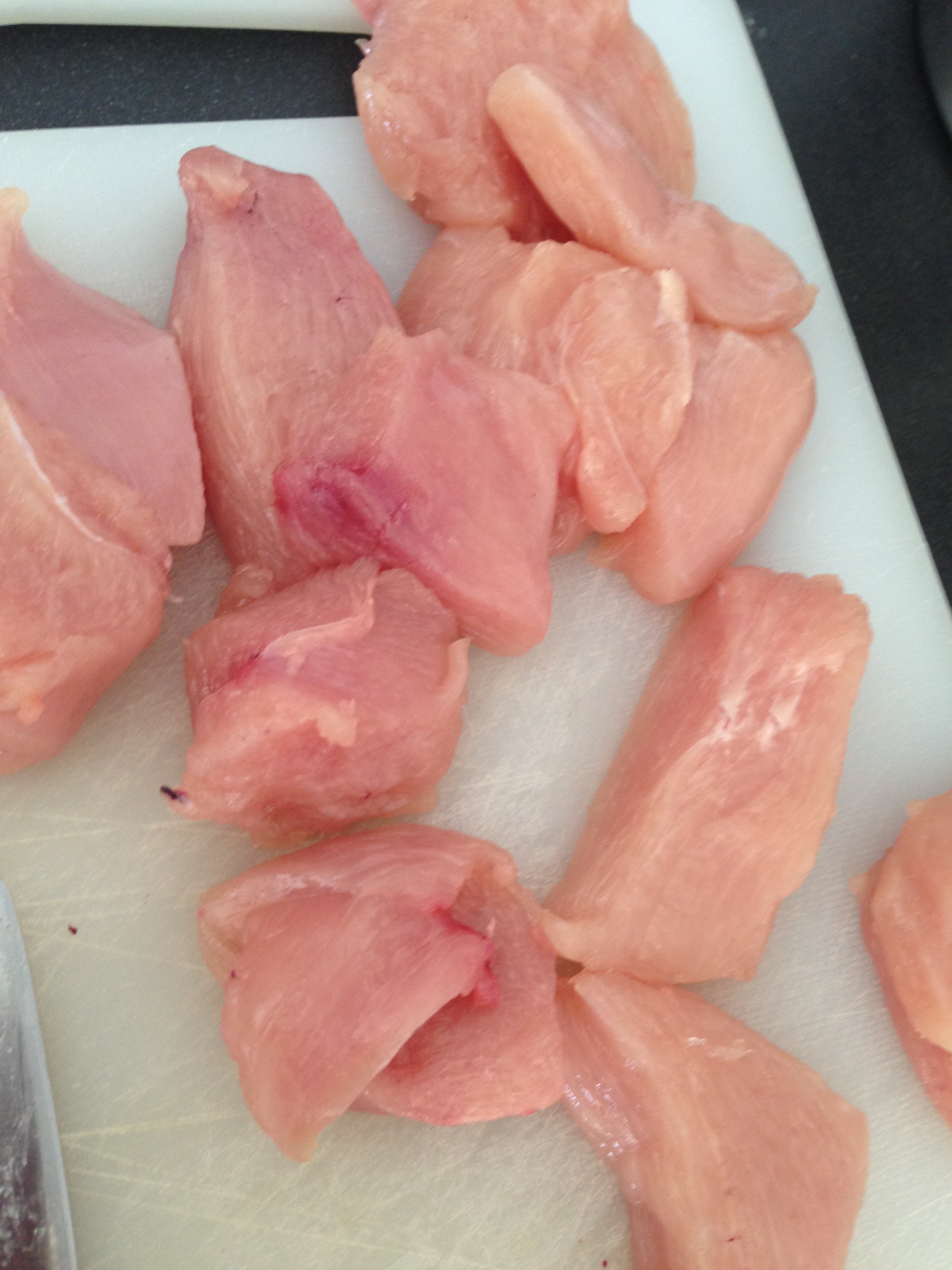 Del kyllingfilet i små stykker. Der kyllingfileten er tykkest, vil jeg anbefale å dele den på tvers først. På den måten trekker bitene mer smak.