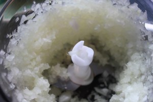 Putt løken i blenderen og mos til en finhakket purè, ta ut i en skål.