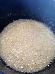 Tilsett olje i en stor gryte, varm opp og tilsett løkpurèn.