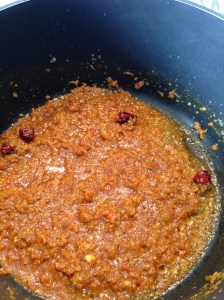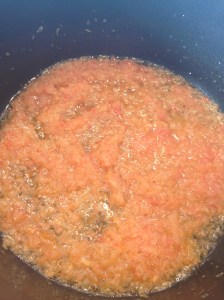 Rør til løken får en gylden farge, ha i tørket chili, hvitløkspurè og ingefærpurè rør par ganger og tilsett så mosede tomater.