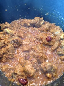 Ha kjøttet i en gryte sammen med nellik, kanelstang og svart kardemomme. Sett på lokk og la det koke på svak varme til det er mørt. Det vil ta noe lenger tid for lammekjøtt enn kyllingkjøtt.