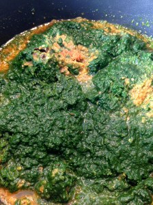 La det hele småkoke i ca.20 minutter over medium styrke, til spinaten blir jevn og oljen pipler opp.